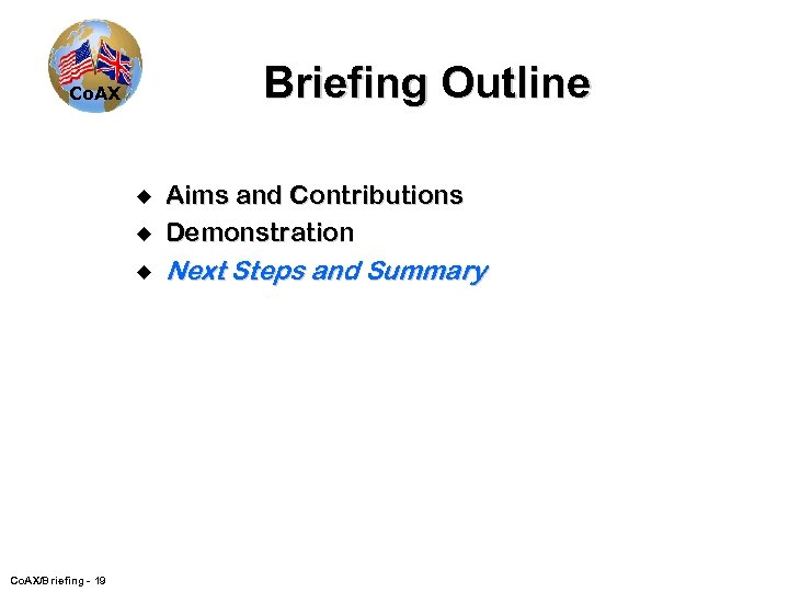Briefing Outline Co. AX u u Demonstration u Co. AX/Briefing - 11 Aims and Contributions Next Steps and Summary