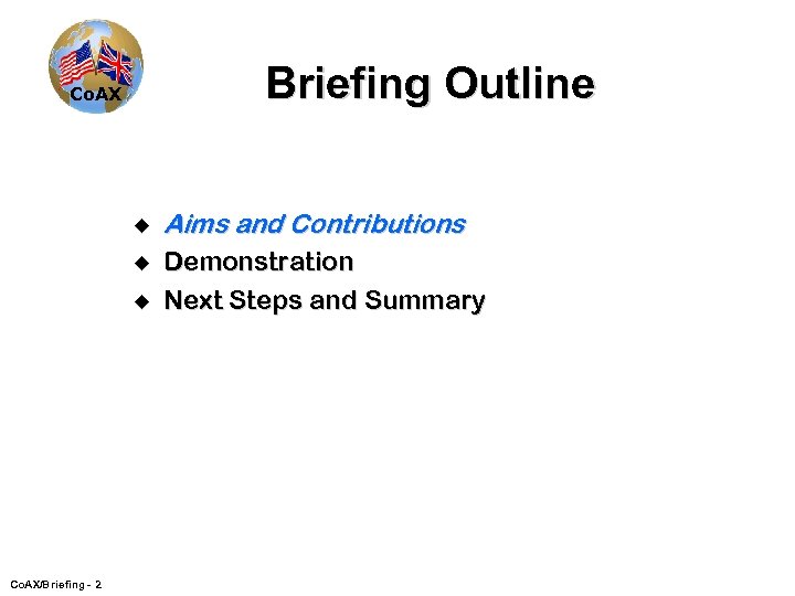 Briefing Outline Co. AX u Aims and Contributions u Demonstration Next Steps and Summary u Co. AX/Briefing - 2