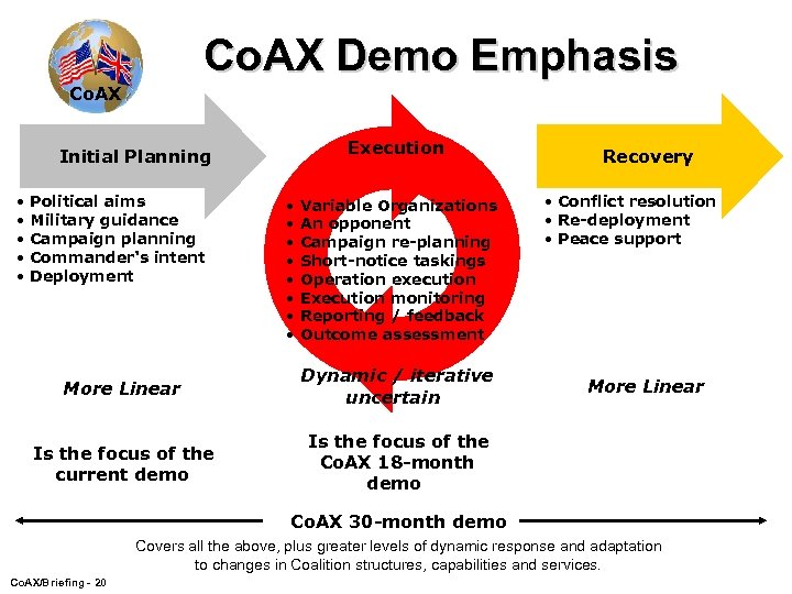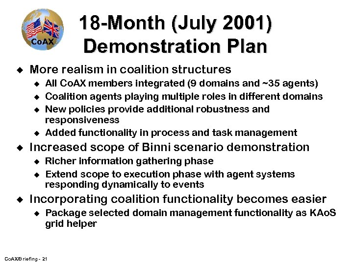 Co. AX Demo Emphasis Co. AX Execution Initial Planning • • • Political aims Military guidance Campaign planning Commander's intent Deployment • • Variable Organizations An opponent Campaign re-planning Short-notice taskings Operation execution Execution monitoring Reporting / feedback Outcome assessment More Linear Dynamic / iterative uncertain Is the focus of the current demo Recovery • Conflict resolution • Re-deployment • Peace support Is the focus of the Co. AX 18 -month demo More Linear Co. AX 30 -month demo Covers all the above, plus greater levels of dynamic response and adaptation to changes in Coalition structures, capabilities and services. Co. AX/Briefing - 20