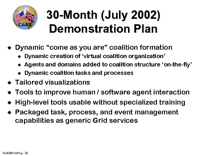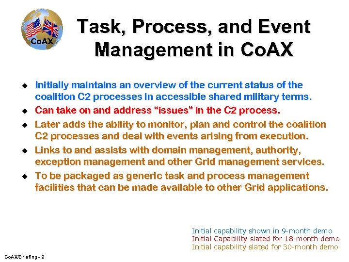 Co. AX u u u Task, Process, and Event Management in Co. AX Initially maintains an overview of the current status of the coalition C 2 processes in accessible shared military terms. Can take on and address “issues” in the C 2 process. Later adds the ability to monitor, plan and control the coalition C 2 processes and deal with events arising from execution. Links to and assists with domain management, authority, exception management and other Grid management services. To be packaged as generic task and process management facilities that can be made available to other Grid applications. Initial capability shown in 9 -month demo Initial Capability slated for 18 -month demo Initial capability slated for 30 -month demo Co. AX/Briefing - 9
