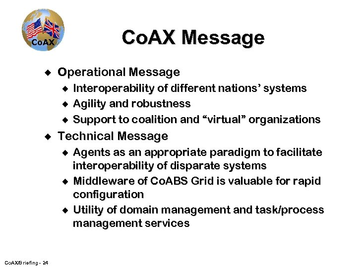 Co. AX u Dynamic “come as you are” coalition formation u u u u 30 -Month (July 2002) Demonstration Plan Dynamic creation of ‘virtual coalition organization’ Agents and domains added to coalition structure ‘on-the-fly’ Dynamic coalition tasks and processes Tailored visualizations Tools to improve human / software agent interaction High-level tools usable without specialized training Packaged task, process, and event management capabilities as generic Grid services Co. AX/Briefing - 23
