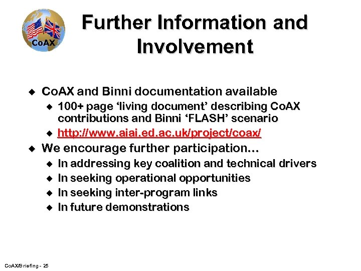 Co. AX u Co. AX and Binni documentation available u u u Further Information and Involvement 100+ page ‘living document’ describing Co. AX contributions and Binni ‘FLASH’ scenario http: //www. aiai. ed. ac. uk/project/coax/ We encourage further participation… u u Co. AX/Briefing - 25 In addressing key coalition and technical drivers In seeking operational opportunities In seeking inter-program links In future demonstrations