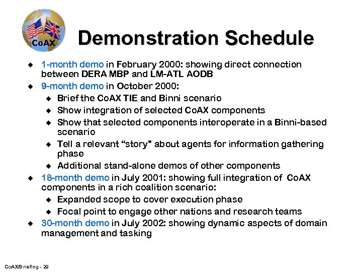 Co. AX u u u Spare Slides Demonstration Schedule Coalition domains slide with final overlay to show the way in which a single person might span a variety of organizational, country and functional domains Further summarization slide Co. AX/Briefing - 28