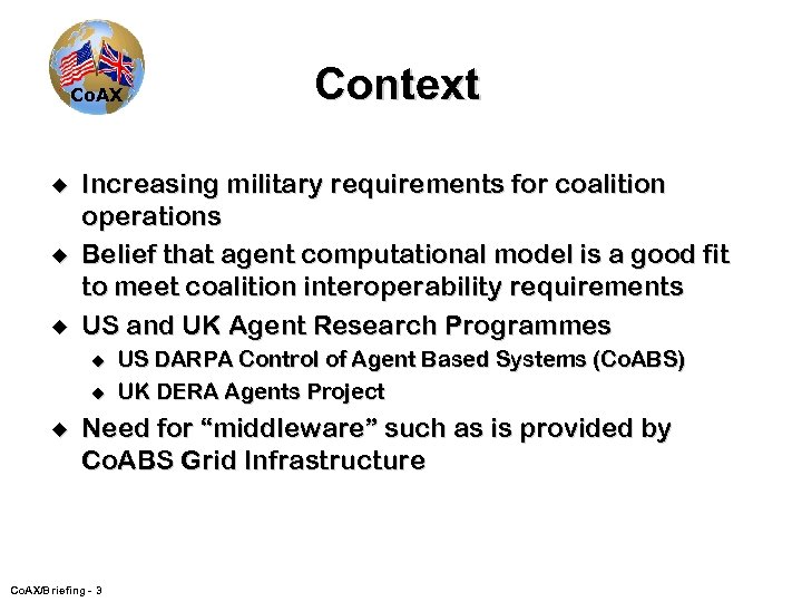 Co. AX u u u Increasing military requirements for coalition operations Belief that agent computational model is a good fit to meet coalition interoperability requirements US and UK Agent Research Programmes u u u Context US DARPA Control of Agent Based Systems (Co. ABS) UK DERA Agents Project Need for “middleware” such as is provided by Co. ABS Grid Infrastructure Co. AX/Briefing - 3