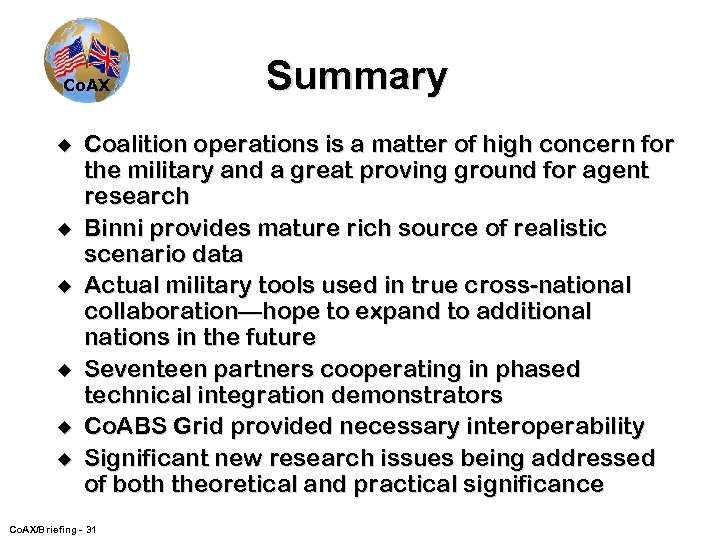 Co. AX u u u Summary Coalition operations is a matter of high concern for the military and a great proving ground for agent research Binni provides mature rich source of realistic scenario data Actual military tools used in true cross-national collaboration—hope to expand to additional nations in the future Seventeen partners cooperating in phased technical integration demonstrators Co. ABS Grid provided necessary interoperability Significant new research issues being addressed of both theoretical and practical significance Co. AX/Briefing - 31