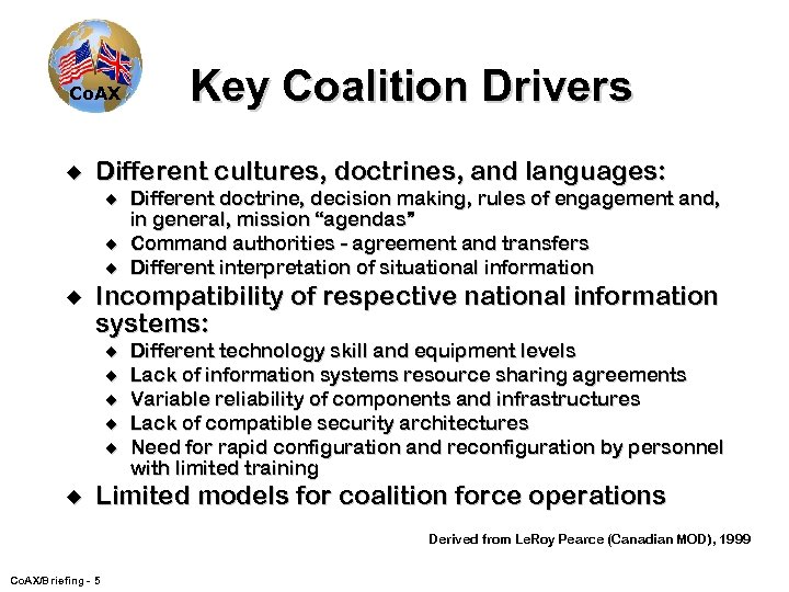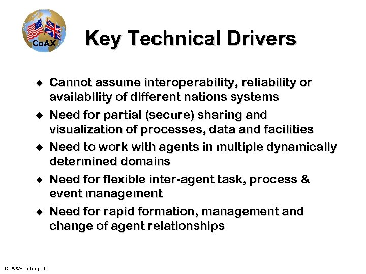 Co. AX u Different cultures, doctrines, and languages: u u Different doctrine, decision making, rules of engagement and, in general, mission “agendas” Command authorities - agreement and transfers Different interpretation of situational information Incompatibility of respective national information systems: u u u Key Coalition Drivers Different technology skill and equipment levels Lack of information systems resource sharing agreements Variable reliability of components and infrastructures Lack of compatible security architectures Need for rapid configuration and reconfiguration by personnel with limited training Limited models for coalition force operations Derived from Le. Roy Pearce (Canadian MOD), 1999 Co. AX/Briefing - 5