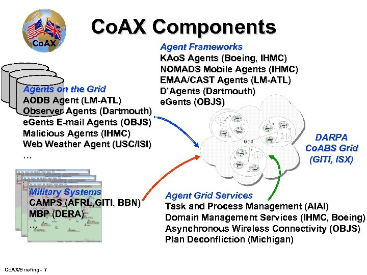 Co. AX u To address unique aspects of coalition operations through the development and evaluation of: u u u agent domain management services agent task, process and event management services Aim will be met through delivery of: u u Aim of Coalition TIE Phased technical demonstrations of increasing complexity Connection of a variety of diverse agent systems Development of generic Coalition-oriented grid services Requirements: u u Co. AX/Briefing - 4 Use of a wide variety of different agent systems Use of existing military (non-agent) applications