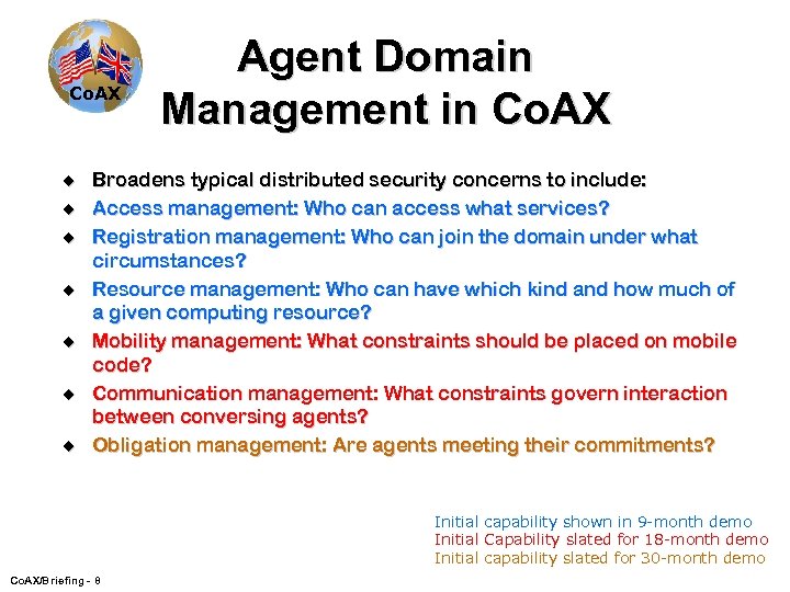 Co. AX u u u u Agent Domain Management in Co. AX Broadens typical distributed security concerns to include: Access management: Who can access what services? Registration management: Who can join the domain under what circumstances? Resource management: Who can have which kind and how much of a given computing resource? Mobility management: What constraints should be placed on mobile code? Communication management: What constraints govern interaction between conversing agents? Obligation management: Are agents meeting their commitments? Initial capability shown in 9 -month demo Initial Capability slated for 18 -month demo Initial capability slated for 30 -month demo Co. AX/Briefing - 8