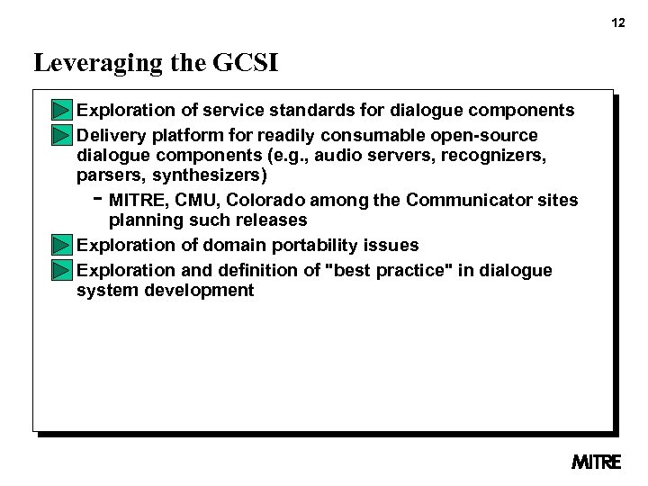 12 Leveraging the GCSI l Exploration of service standards for dialogue components l Delivery platform for readily consumable open-source dialogue components (e. g. , audio servers, recognizers, parsers, synthesizers) MITRE, CMU, Colorado among the Communicator sites planning such releases l Exploration of domain portability issues l Exploration and definition of "best practice" in dialogue system development -