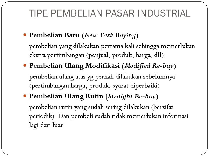 TIPE PEMBELIAN PASAR INDUSTRIAL Pembelian Baru (New Task Buying) pembelian yang dilakukan pertama kali sehingga memerlukan ekstra pertimbangan (penjual, produk, harga, dll) Pembelian Ulang Modifikasi (Modified Re-buy) pembelian ulang atas yg pernah dilakukan sebelumnya (pertimbangan harga, produk, syarat diperbaiki) Pembelian Ulang Rutin (Straight Re-buy) pembelian rutin yang sudah sering dilakukan (bersifat periodik). Dan pembeli sudah tidak memerlukan informasi lagi dari luar.