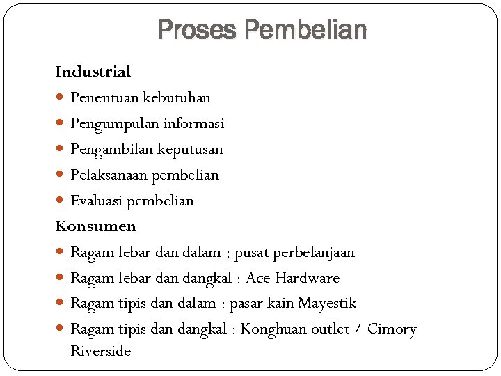 Proses Pembelian Industrial Penentuan kebutuhan Pengumpulan informasi Pengambilan keputusan Pelaksanaan pembelian Evaluasi pembelian Konsumen Ragam lebar dan dalam : pusat perbelanjaan Ragam lebar dangkal : Ace Hardware Ragam tipis dan dalam : pasar kain Mayestik Ragam tipis dangkal : Konghuan outlet / Cimory Riverside