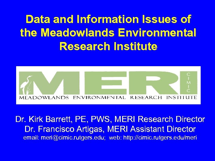 Data and Information Issues of the Meadowlands Environmental Research Institute Dr. Kirk Barrett, PE, PWS, MERI Research Director Dr. Francisco Artigas, MERI Assistant Director email: meri@cimic. rutgers. edu; web: http: //cimic. rutgers. edu/meri