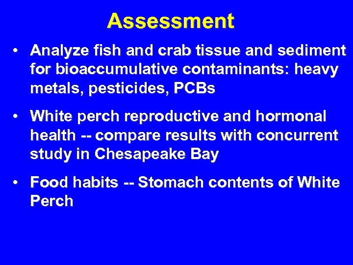 Assessment • Analyze fish and crab tissue and sediment for bioaccumulative contaminants: heavy metals, pesticides, PCBs • White perch reproductive and hormonal health -- compare results with concurrent study in Chesapeake Bay • Food habits -- Stomach contents of White Perch