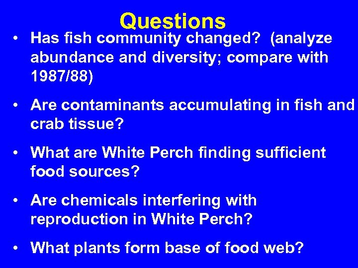 Questions • Has fish community changed? (analyze abundance and diversity; compare with 1987/88) • Are contaminants accumulating in fish and crab tissue? • What are White Perch finding sufficient food sources? • Are chemicals interfering with reproduction in White Perch? • What plants form base of food web?