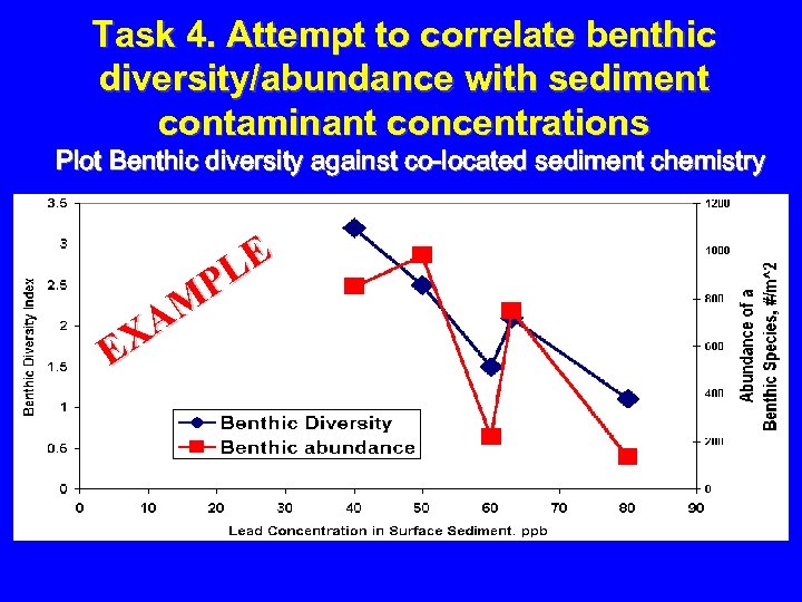 Task 4. Attempt to correlate benthic diversity/abundance with sediment contaminant concentrations Plot Benthic diversity against co-located sediment chemistry LE P M XA E