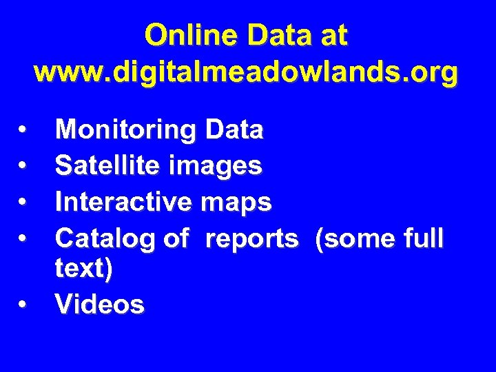 Online Data at www. digitalmeadowlands. org • • Monitoring Data Satellite images Interactive maps Catalog of reports (some full text) • Videos