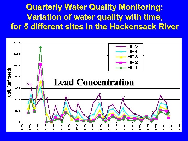 Quarterly Water Quality Monitoring: Variation of water quality with time, for 5 different sites in the Hackensack River Lead Concentration