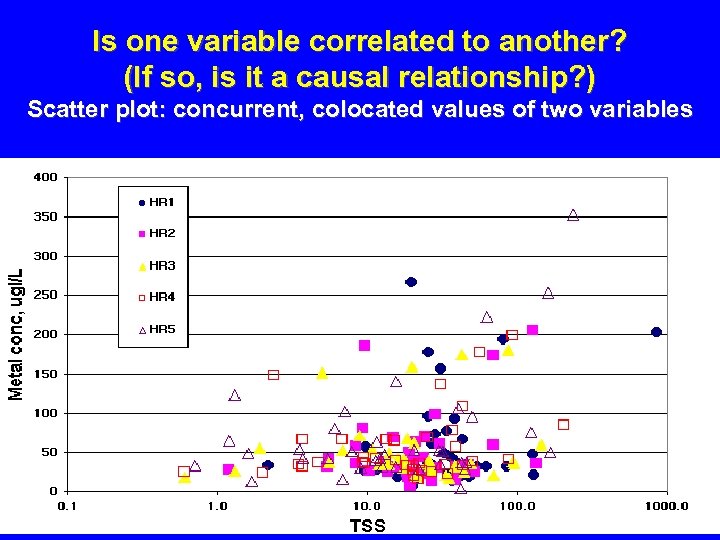 Is one variable correlated to another? (If so, is it a causal relationship? ) Scatter plot: concurrent, colocated values of two variables