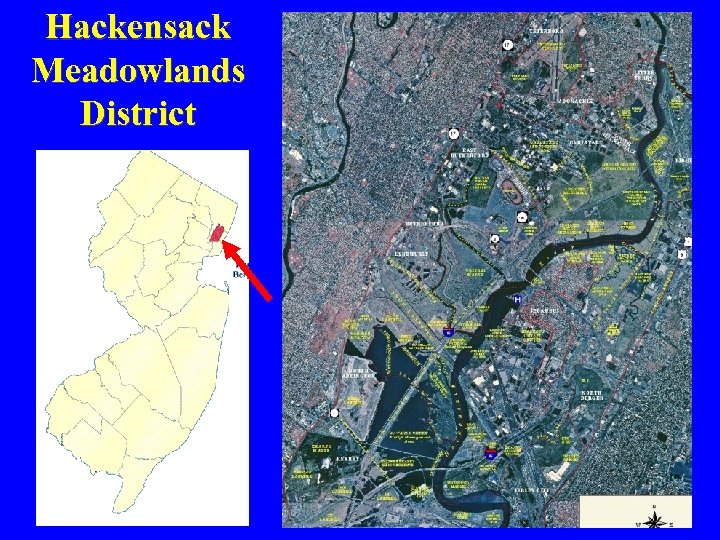 Important and Distinctive Features • Administered by the New Jersey Meadowlands Commission, a NJ state agency, created in 1969 • River, tidal creeks, human-made channels, wetlands cover 3400 hectares (8400 acres) or 40% of District’s 32 sq miles • Legacy of past industrial waste discharge and solid waste disposal -- 520 ha (1300 ac) of landfills, >100 contaminated sites • Intense transportation infrastructure; large existing developments; intense development pressure • Supports 250 bird, 31 fish and 23 invertebrate species including 21 threatened or endangered species • Active wetland enhancement and environmental education programs by NJMC • Carefully watched by environmental advocates