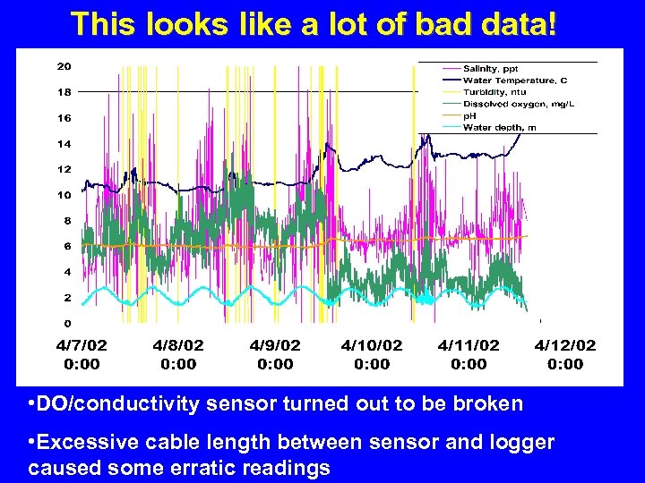 This looks like a lot of bad data! • DO/conductivity sensor turned out to be broken • Excessive cable length between sensor and logger caused some erratic readings
