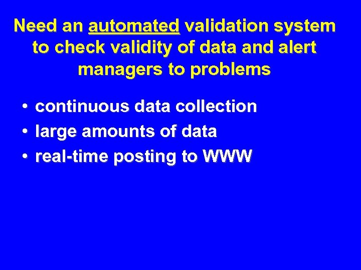 Need an automated validation system to check validity of data and alert managers to problems • • • continuous data collection large amounts of data real-time posting to WWW