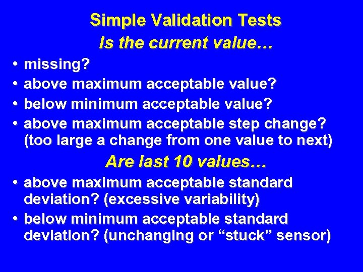 Simple Validation Tests Is the current value… • • missing? above maximum acceptable value? below minimum acceptable value? above maximum acceptable step change? (too large a change from one value to next) Are last 10 values… • above maximum acceptable standard deviation? (excessive variability) • below minimum acceptable standard deviation? (unchanging or “stuck” sensor)