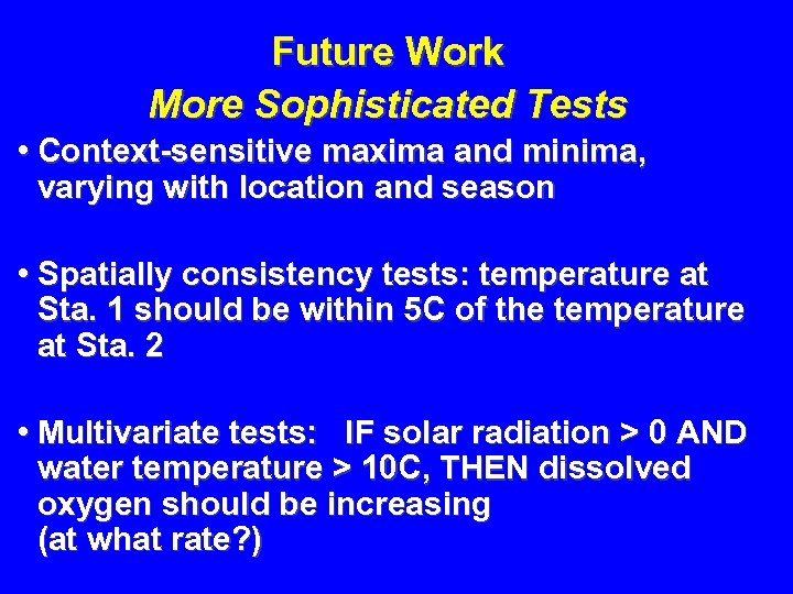 Future Work More Sophisticated Tests • Context-sensitive maxima and minima, varying with location and season • Spatially consistency tests: temperature at Sta. 1 should be within 5 C of the temperature at Sta. 2 • Multivariate tests: IF solar radiation > 0 AND water temperature > 10 C, THEN dissolved oxygen should be increasing (at what rate? )