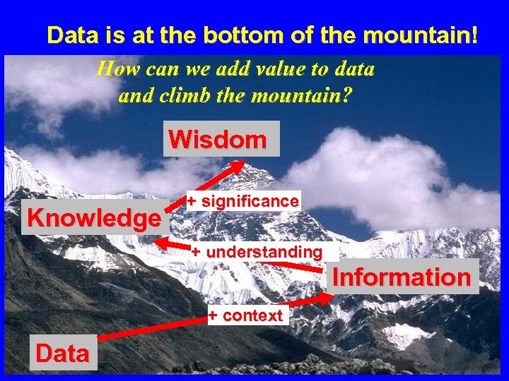 Data is at the bottom of the mountain! How can we add value to data and climb the mountain? Wisdom Knowledge + significance + understanding Information + context Data