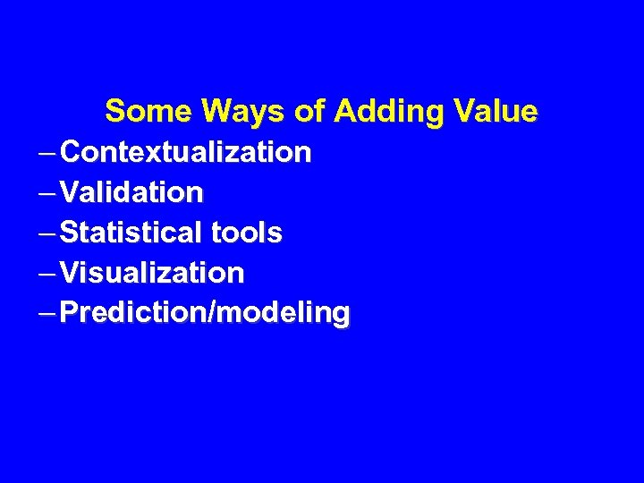 Some Ways of Adding Value – Contextualization – Validation – Statistical tools – Visualization – Prediction/modeling