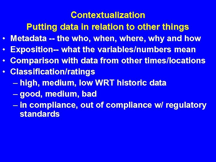 Contextualization Putting data in relation to other things • • Metadata -- the who, when, where, why and how Exposition-- what the variables/numbers mean Comparison with data from other times/locations Classification/ratings – high, medium, low WRT historic data – good, medium, bad – in compliance, out of compliance w/ regulatory standards