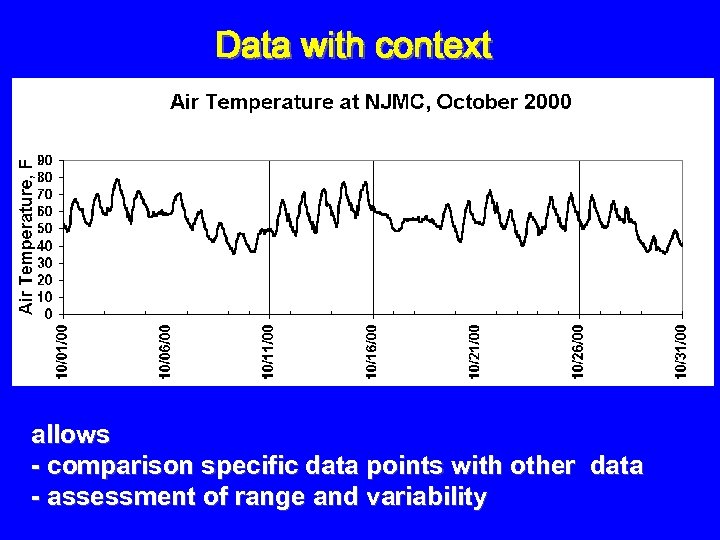 Data with (some) metadata Air temperature (deg F) at the NJMC headquarters 10/14/00 18: 45: 68. 0 10/14/00 19: 00: 67. 7 10/14/00 19: 15: 66. 5 10/14/00 19: 30: 66. 6 10/14/00 19: 45: 66. 6 10/14/00 20: 00: 66. 5