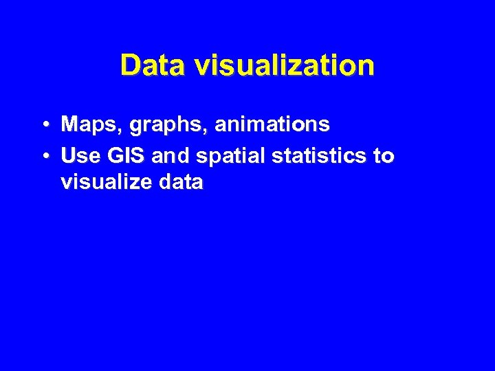 Data visualization • Maps, graphs, animations • Use GIS and spatial statistics to visualize data