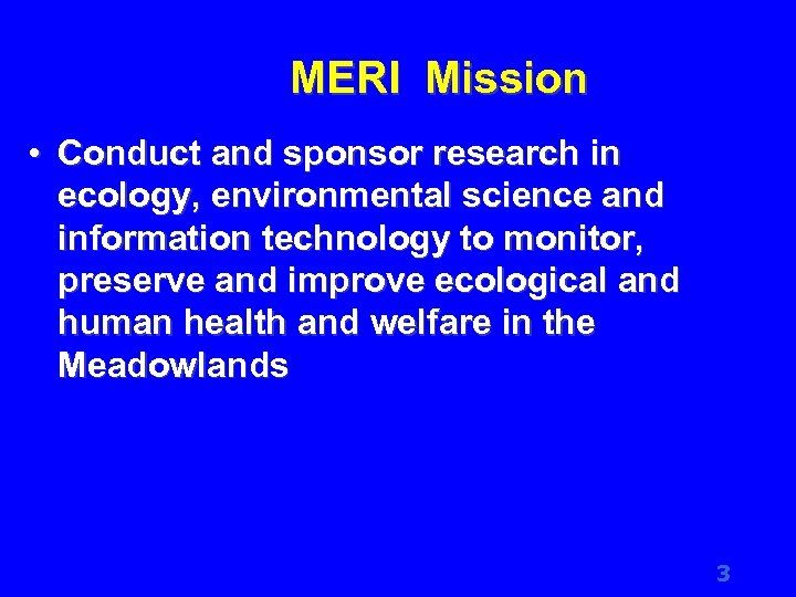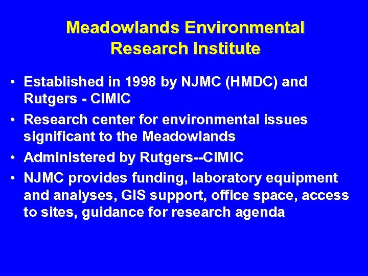 Meadowlands Environmental Research Institute • Established in 1998 by NJMC (HMDC) and Rutgers - CIMIC • Research center for environmental issues significant to the Meadowlands • Administered by Rutgers--CIMIC • NJMC provides funding, laboratory equipment and analyses, GIS support, office space, access to sites, guidance for research agenda