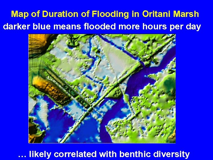 Map of Duration of Flooding in Oritani Marsh darker blue means flooded more hours per day … likely correlated with benthic diversity