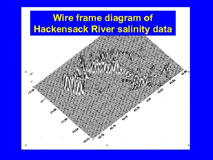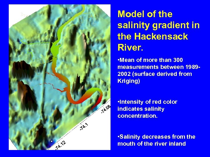 Model of the salinity gradient in the Hackensack River. • Mean of more than 300 measurements between 19892002 (surface derived from Kriging) • Intensity of red color indicates salinity concentration. • Salinity decreases from the mouth of the river inland