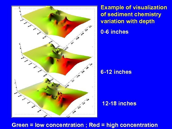 Example of visualization of sediment chemistry variation with depth 0 -6 inches 6 -12 inches 12 -18 inches Green = low concentration ; Red = high concentration