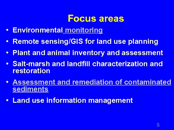 Focus areas • Environmental monitoring • Remote sensing/GIS for land use planning • Plant and animal inventory and assessment • Salt-marsh and landfill characterization and restoration • Assessment and remediation of contaminated sediments • Land use information management 5