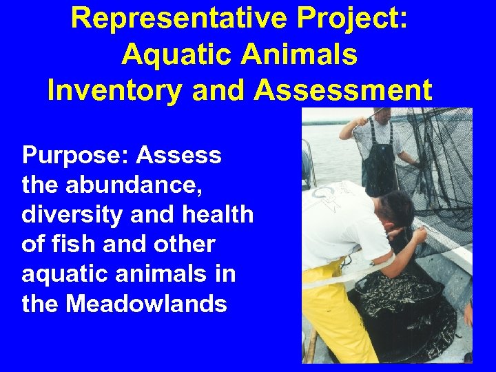 Representative Project: Aquatic Animals Inventory and Assessment Purpose: Assess the abundance, diversity and health of fish and other aquatic animals in the Meadowlands