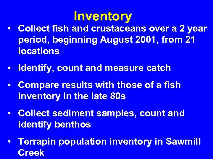 Inventory • Collect fish and crustaceans over a 2 year period, beginning August 2001, from 21 locations • Identify, count and measure catch • Compare results with those of a fish inventory in the late 80 s • Collect sediment samples, count and identify benthos • Terrapin population inventory in Sawmill Creek