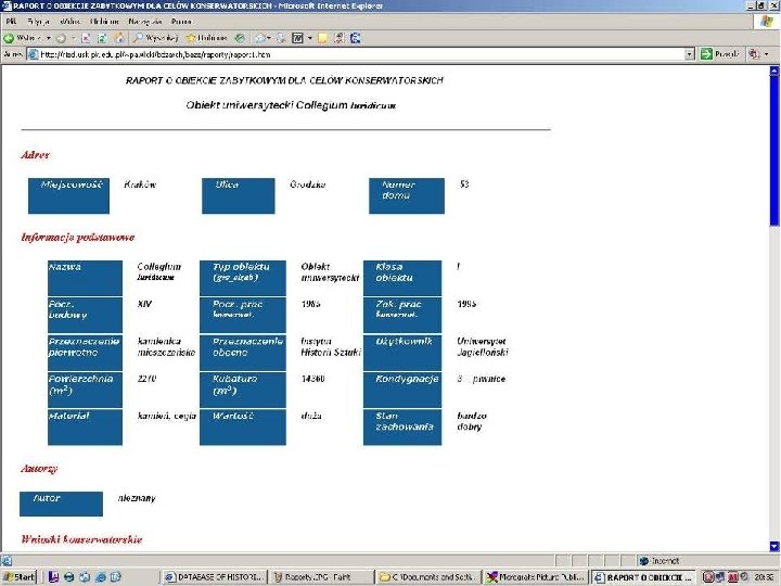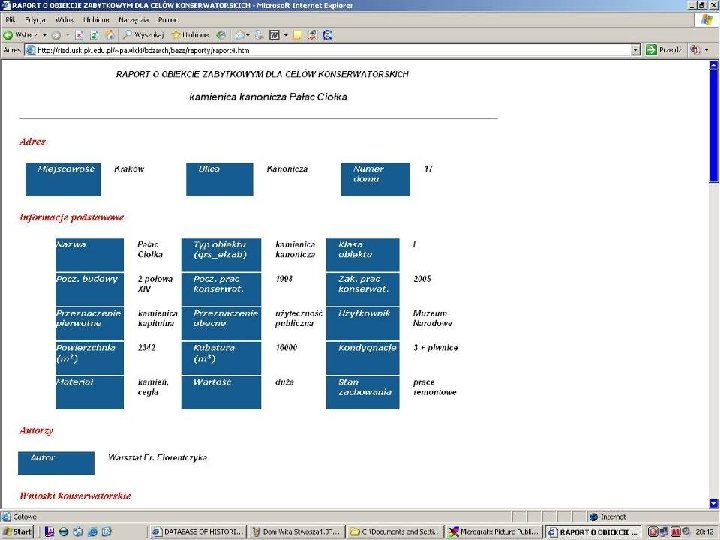 The Historic Object Card The button DETAILS displays the Historic Object Card, i. e. a full report with all the data on a given historic object collected in the base. The data comprise: the basic information, the addresses of the object, identificators, academic and historic value, the authors of the work, the builders, owners, users, investors, the state of preservation, realization stages, inspections, bibliography, events, photographic documentation and the status of the record.