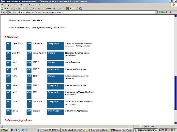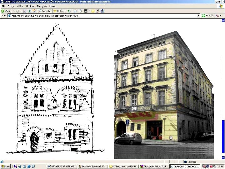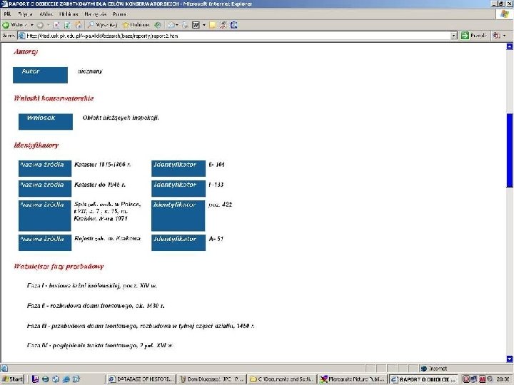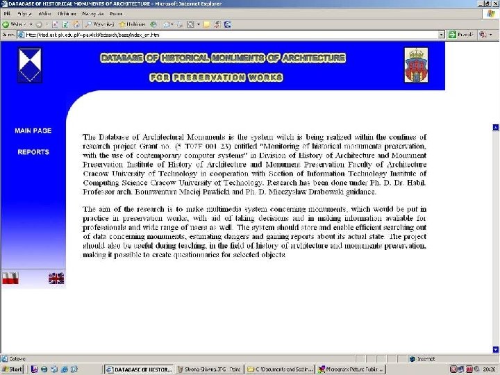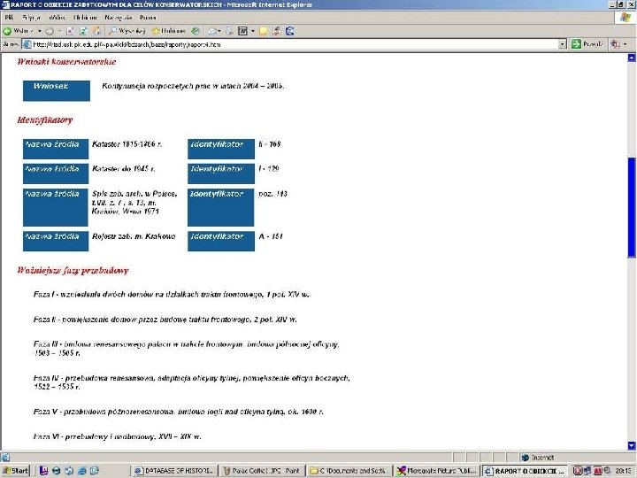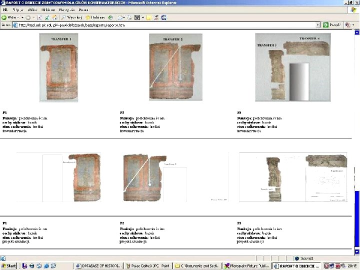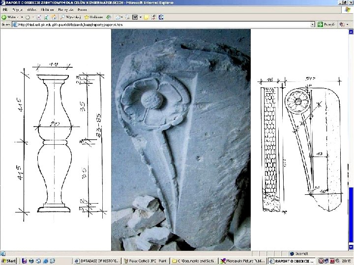 The aim of the research is to make multimedia system concerning monuments, which would be put in practice in preservation works, with aid of taking decisions and in making information available for professionals and wide range of users as well. The system should store and enable efficient searching out of data concerning monuments, estimating dangers and gaining reports about its actual state. The project should also be useful during teaching, in the field of history of architecture and monuments preservation, making it possible to create questionnaires for selected objects.