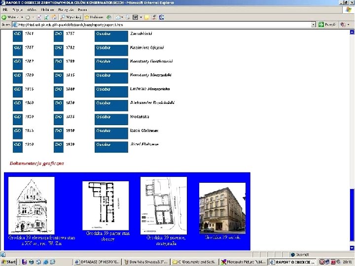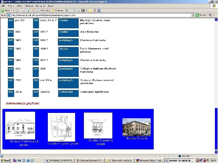 The Database of Architectural Monuments is the system witch is being realized within the confines of research project Grant no. (5 T 07 F 001 23) entitled Monitoring of historical monuments preservation, with the use of contemporary computer systems in Division of History of Architecture and Monument Preservation Institute of History of Architecture and Monument Preservation Faculty of Architecture Cracow University of Technology in cooperation with Section of Information Technology Institute of Computing Science Cracow University of Technology. Research has been done under Ph. D. Professor arch. Bonawentura Maciej Pawlicki and Ph. D. Mieczysław Drabowski guidance.