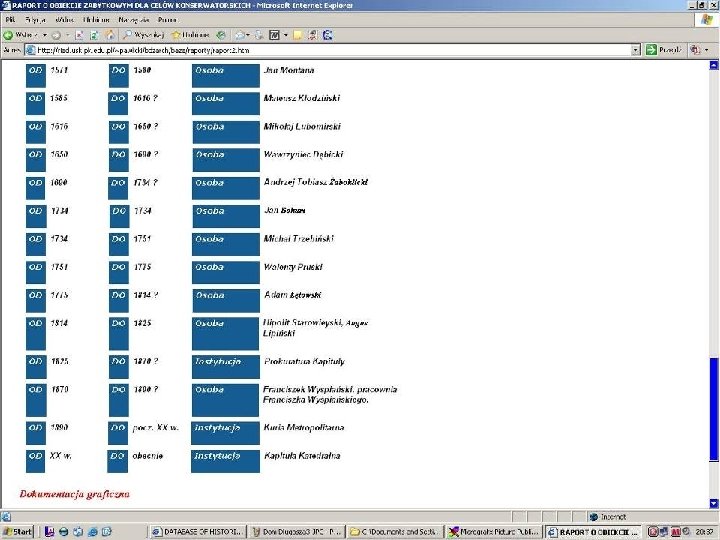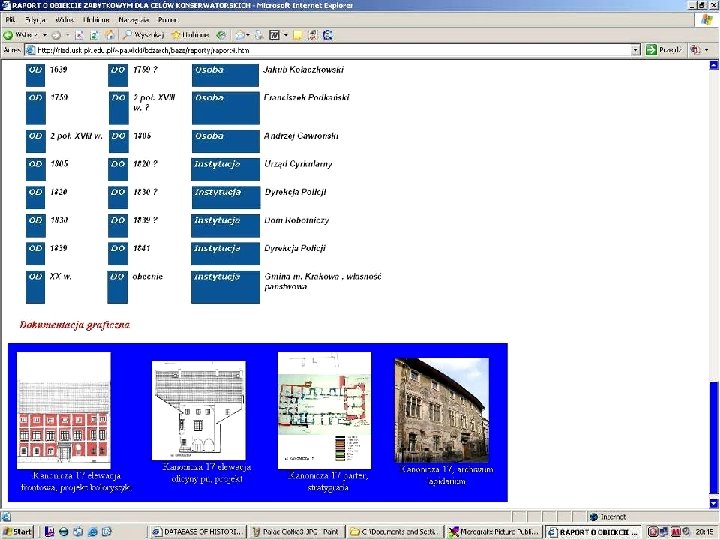 Bibliography Pawlicki B. M. , Czechowicz J. , Drabowski M. , Modern methods of Data Processing of the Old Historical Structure for Need Polish System information of Monuments on Example of Cracow in Cultural Heritage. In: GIS Polonia 2001. Warsaw 2001. Pawlicki B. M. , Drabowski M. , Information technology for recognition, protection and management of cultural heritage. In: GIS Odyssey 2002, Geographical Information Systems. Zagreb 2002, pp. 330 – 344. Pawlicki B. M. , Drabowski M. , Karpisz D. , Active Database for Estimating Conditions of Historical Objects for Conservator’s Purposes. In: Inżynieria wiedzy i systemy ekspertowe, (Engineering of knowledge and expert systems), Wrocław 2003, pp. 449 - 455. Pawlicki B. M. , Drabowski M, Czechowicz J. , Czajkowski K. , Karpisz D. , Nassery F. , Database of Historical Monuments The New Approach. In: Geographical Information Systems Interdisciplinary Aspects, Sosnowiec - Zagreb 2003, s. 439 - 451. Pawlicki B. M. , Nowe technologie w rozpoznawaniu, diagnostyce i monitorowaniu zabytków, (The New Technologies for recognition, diagnostics and monitoring of Historical Monuments). In: “Dziedzictwo kultury wobec zagrożeń wojny i pokoju”, Warsaw 2004, pp. 118 -124.