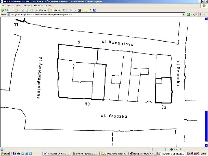 This publication aims at development and activation of the database for the purpose of further studies and restoration projects pertaining to the Cracow historic buildings complex. The base application has taken into account the latest research on the space organization and arrangement of houses of the 1 st and 2 nd stage in the area of the oldest settlement (“Okol”) situated at the foot of the Wawel Hill, from the period prior to the Great Chartering of Krakow in 1257. It presents the buildings situated in Kanonicza Street, inter alia: The Długosz House, (25 Kanonicza st. ), the Bishop Erazm Ciołek Palace (17 Kanonicza st. ), Collegium Iuridicum (25 Grodzka st. ), Wit Stwosz House (39 Grodzka st. ).