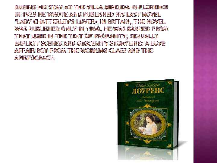 NOVELS 1911 - THE WHITE PEACOCK 1912 - THE TRESPASSER 1913 - "SONS AND LOVERS" 1915 - "RAINBOW" 1925 - "FAMILY BRENGUENOV" 1920 - "WOMEN IN LOVE" 1920 - THE LOST GIRL 1922 - "AARON'S FLUTE" 1923 - KANGAROO 1924 - "JACK IN AUSTRALIA" 1926 - "FEATHERED SERPENT" 1928 - "LADY CHATTERLEY'S LOVER" 1929 - THE ESCAPED COCK 1930 - "THE VIRGIN AND THE GYPSY"