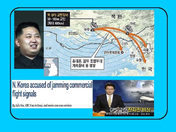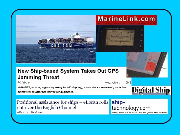 Low-powered GPS jammer on ship Jammer of less than 1 milli. Watt: • False positions, and velocities • Autopilot may turn vessel • But no alarms! With a little more jammer power: • Electronic Chart Displays • Autopilot • Automatic Identification System • Differential GPS • Satellite voice and data comms • Maritime distress safety system plus … Ship’s Radar & Gyrocompass © David Last