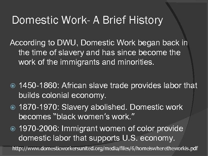 Domestic Work- A Brief History According to DWU, Domestic Work began back in the time of slavery and has since become the work of the immigrants and minorities. 1450 -1860: African slave trade provides labor that builds colonial economy. 1870 -1970: Slavery abolished. Domestic work becomes “black women’s work. ” 1970 -2006: Immigrant women of color provide domestic labor that supports U. S. economy. http: //www. domesticworkersunited. org/media/files/6/homeiswheretheworkis. pdf