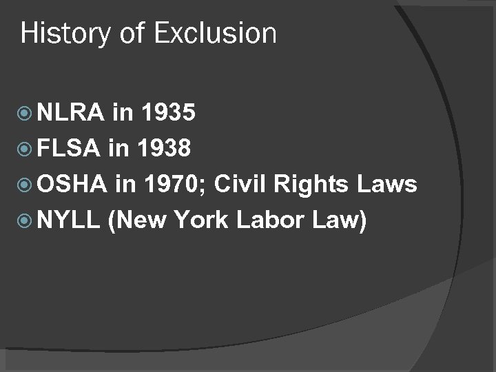 History of Exclusion NLRA in 1935 FLSA in 1938 OSHA in 1970; Civil Rights Laws NYLL (New York Labor Law)