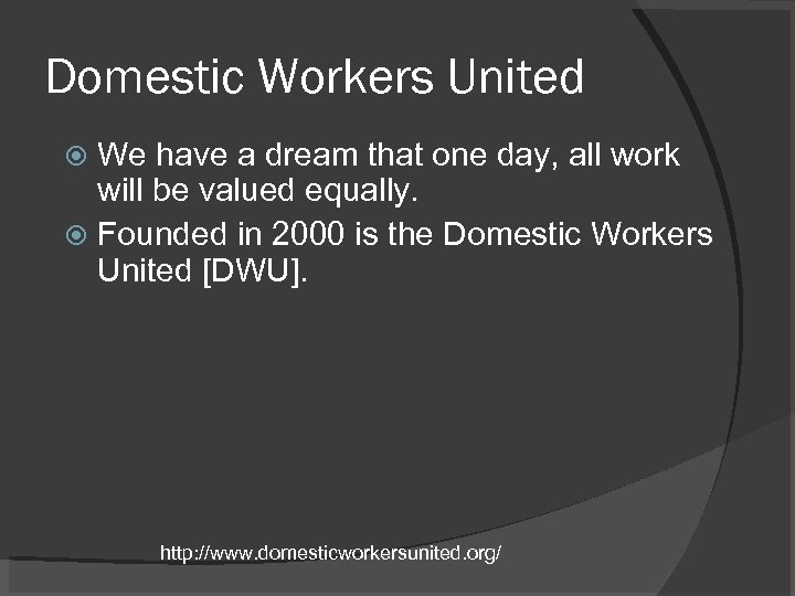 Domestic Workers United We have a dream that one day, all work will be valued equally. Founded in 2000 is the Domestic Workers United [DWU]. http: //www. domesticworkersunited. org/