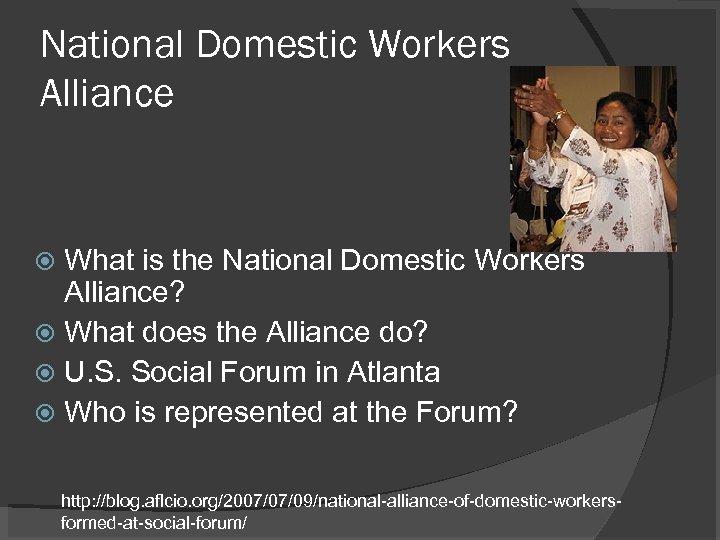 National Domestic Workers Alliance What is the National Domestic Workers Alliance? What does the Alliance do? U. S. Social Forum in Atlanta Who is represented at the Forum? http: //blog. aflcio. org/2007/07/09/national-alliance-of-domestic-workersformed-at-social-forum/